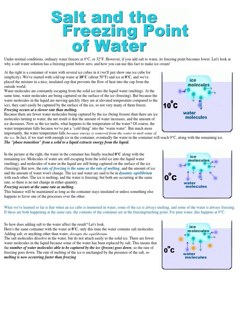 A chemical change between the water and other substance keeps it from freezing at 0 degrees celsius 32 degrees fahrenheit. You may try different concentrations of the same salt to see the effect on waters freezing point or you could try the same concentration of different substances. Figure 1 freezing point apparatus in ice salt water bath.